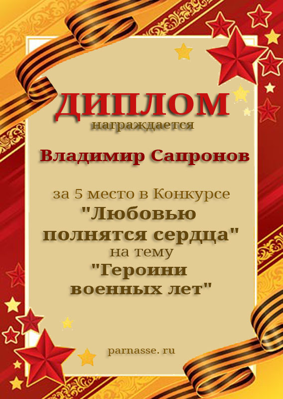 За 5 место в Конкурсе "Любовью полнятся сердца" на тему "Героини военных лет"