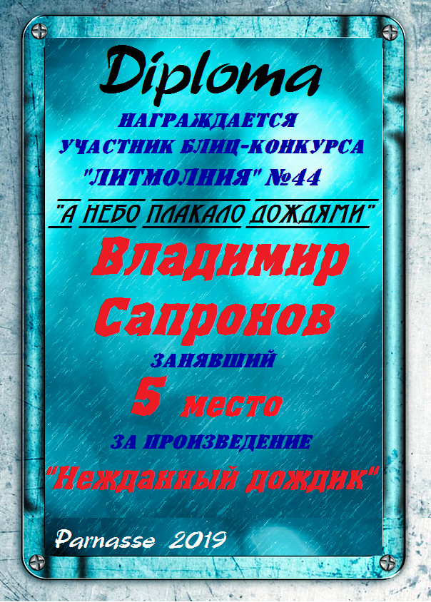 Пятое место в Блиц-конкурсе №44 «А небо плакало дождями» за произведение «Нежданный дождик». Поздравляем!