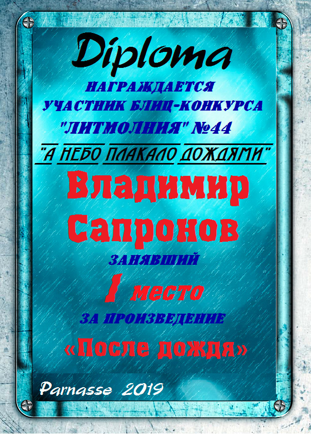 Первое место в Блиц-конкурсе №44 «А небо плакало дождями» за произведение «После дождя». Поздравляем!