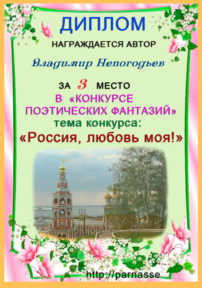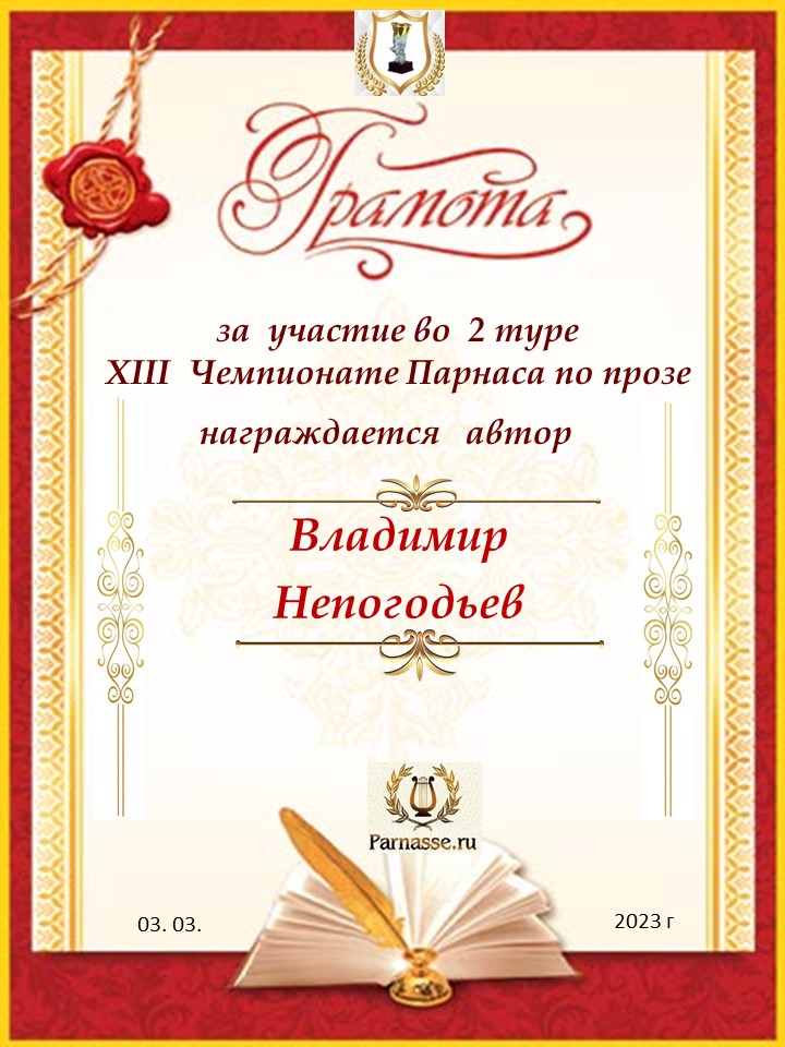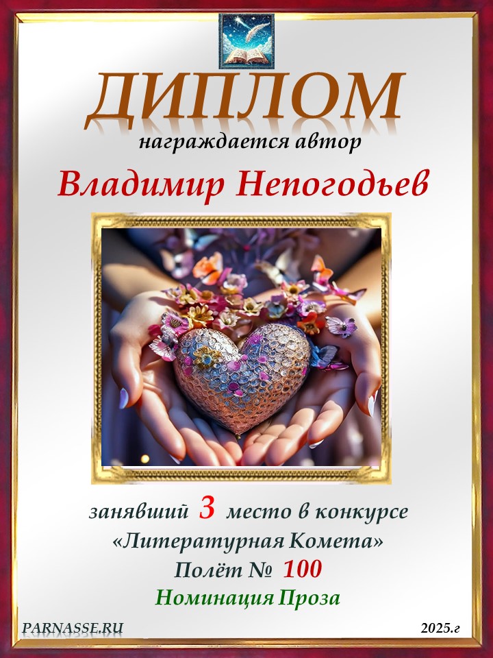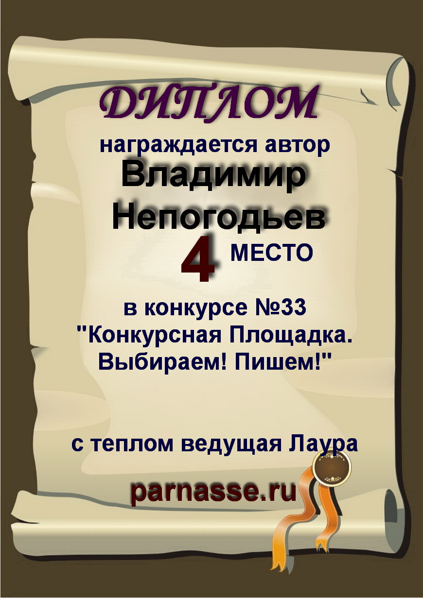 Номинация "Лучшее поздравление Парнасу в прозе".Искренне и от всего сердца благодарим Вас, ВЛАДИМИР, за участие в юбилейном конкурсе, за Ваши прекрасные, ярчайшие слова благодарности нашему порталу! Мы желаем Вам крепкого здоровья, жизнелюбия, творческой Музы и исполнения самых заветных желаний, которые только у Вас есть!