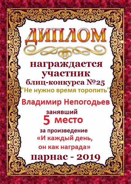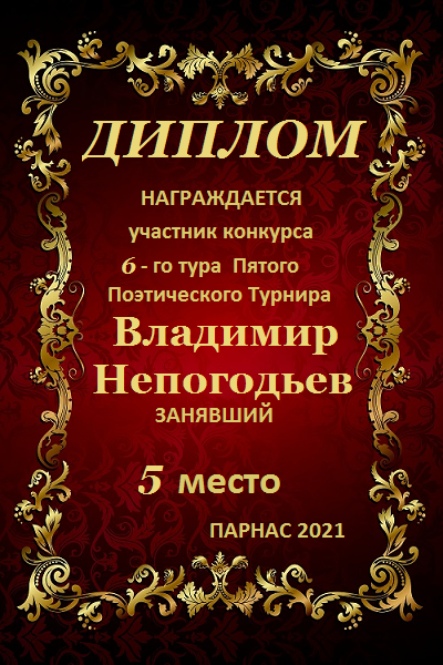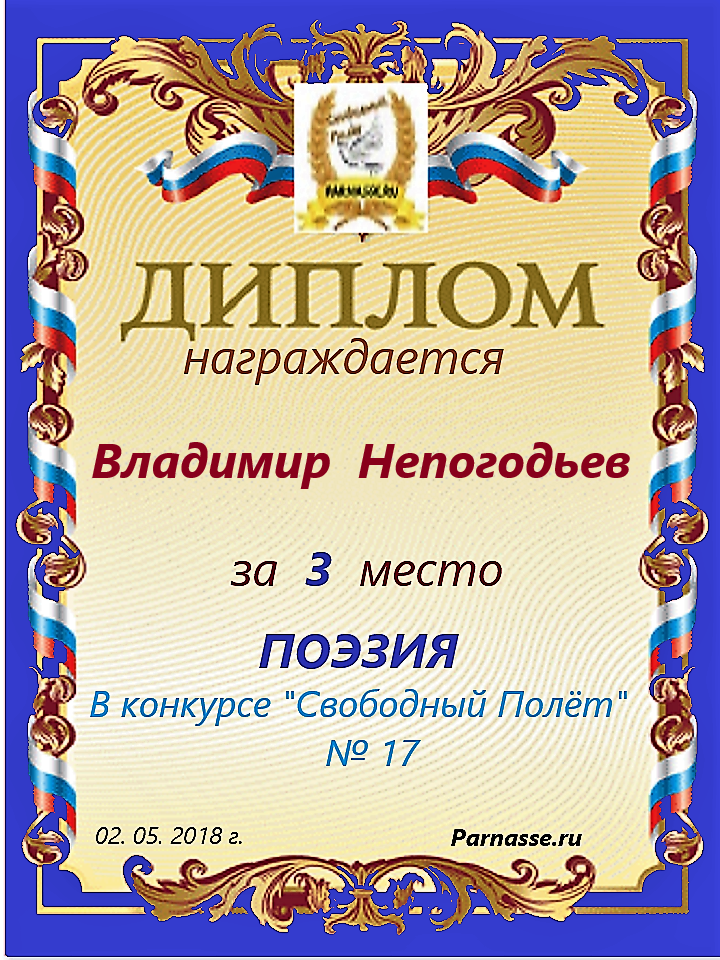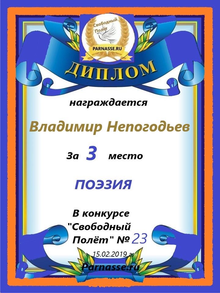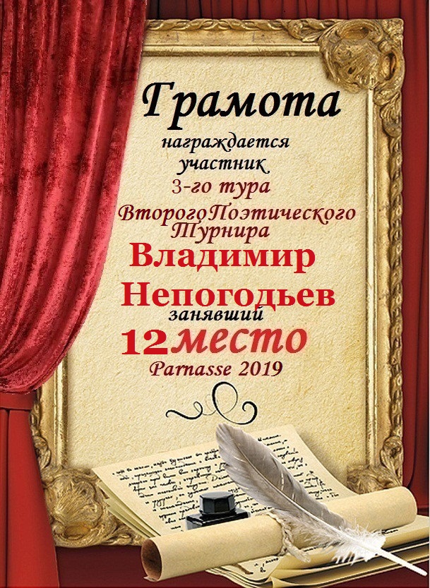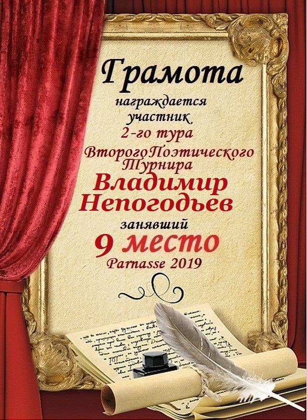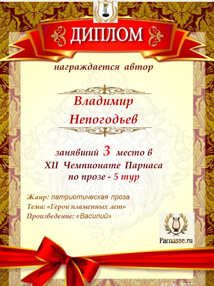 Номинация "Лучшее поздравление Парнасу в прозе".Искренне и от всего сердца благодарим Вас, ВЛАДИМИР, за участие в юбилейном конкурсе, за Ваши прекрасные, ярчайшие слова благодарности нашему порталу! Мы желаем Вам крепкого здоровья, жизнелюбия, творческой Музы и исполнения самых заветных желаний, которые только у Вас есть!