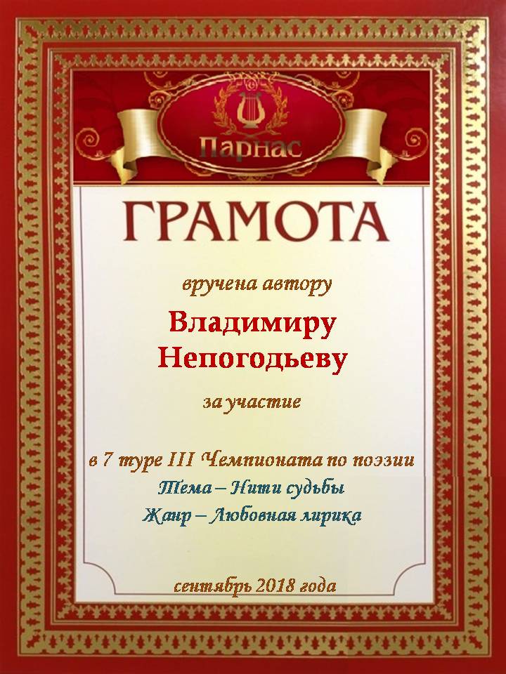 Номинация "Лучшая поздравительная песнь Парнасу". Разрешите Вас поблагодарить за великолепные, преисполненные тепла и добра песни, адресованные в эту замечательную дату нашему любимому сайту. Три года – это не срок, но дата! "Парнас" стал на ноги, но без таких авторов как Вы, это было бы невозможно! Спасибо Вам за все, будьте всегда жизнерадостны, любимы, добры и счастливы, а Ваше прекрасное творчество пусть регулярно радует наш слух и душу! Будьте здоровы!