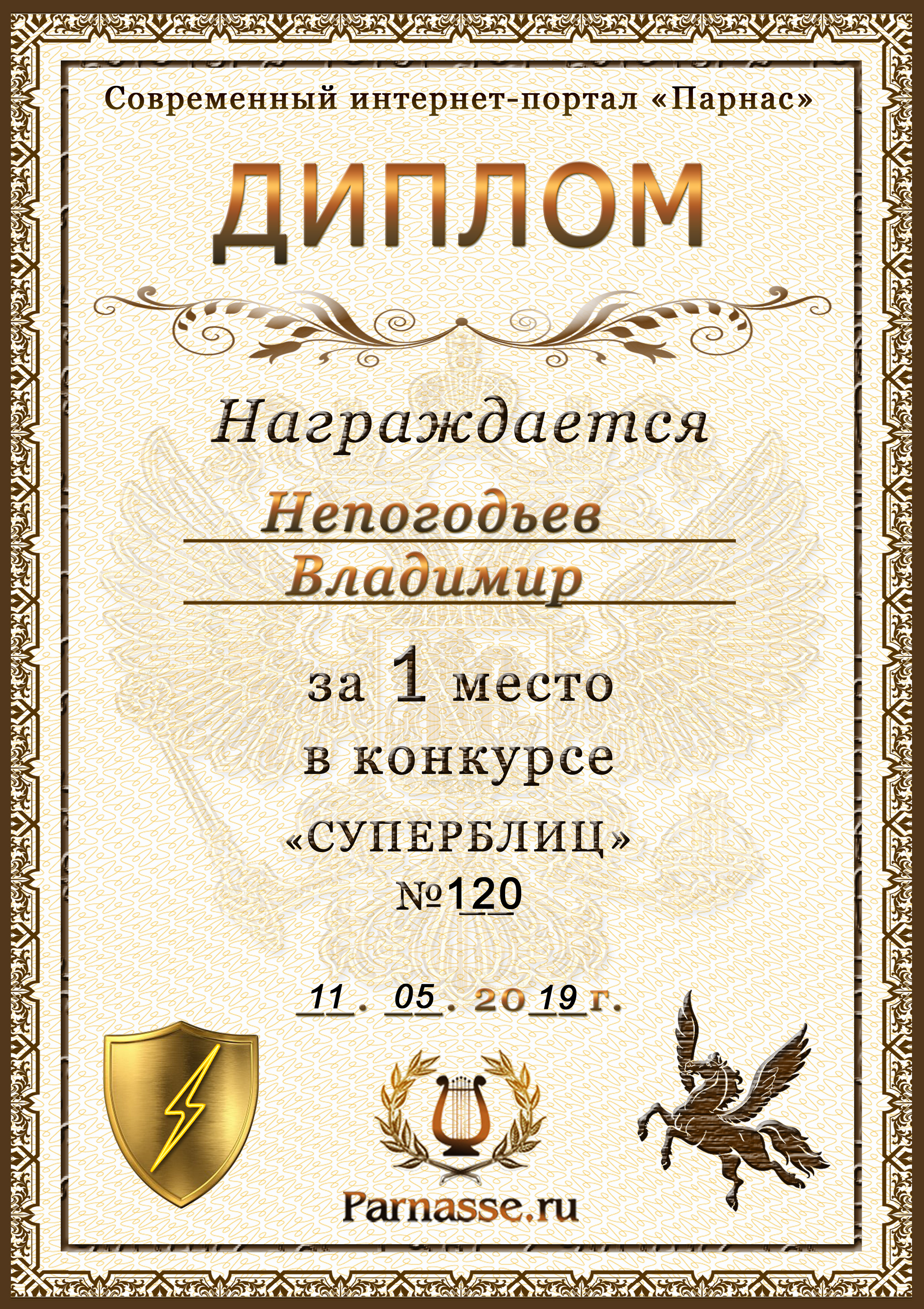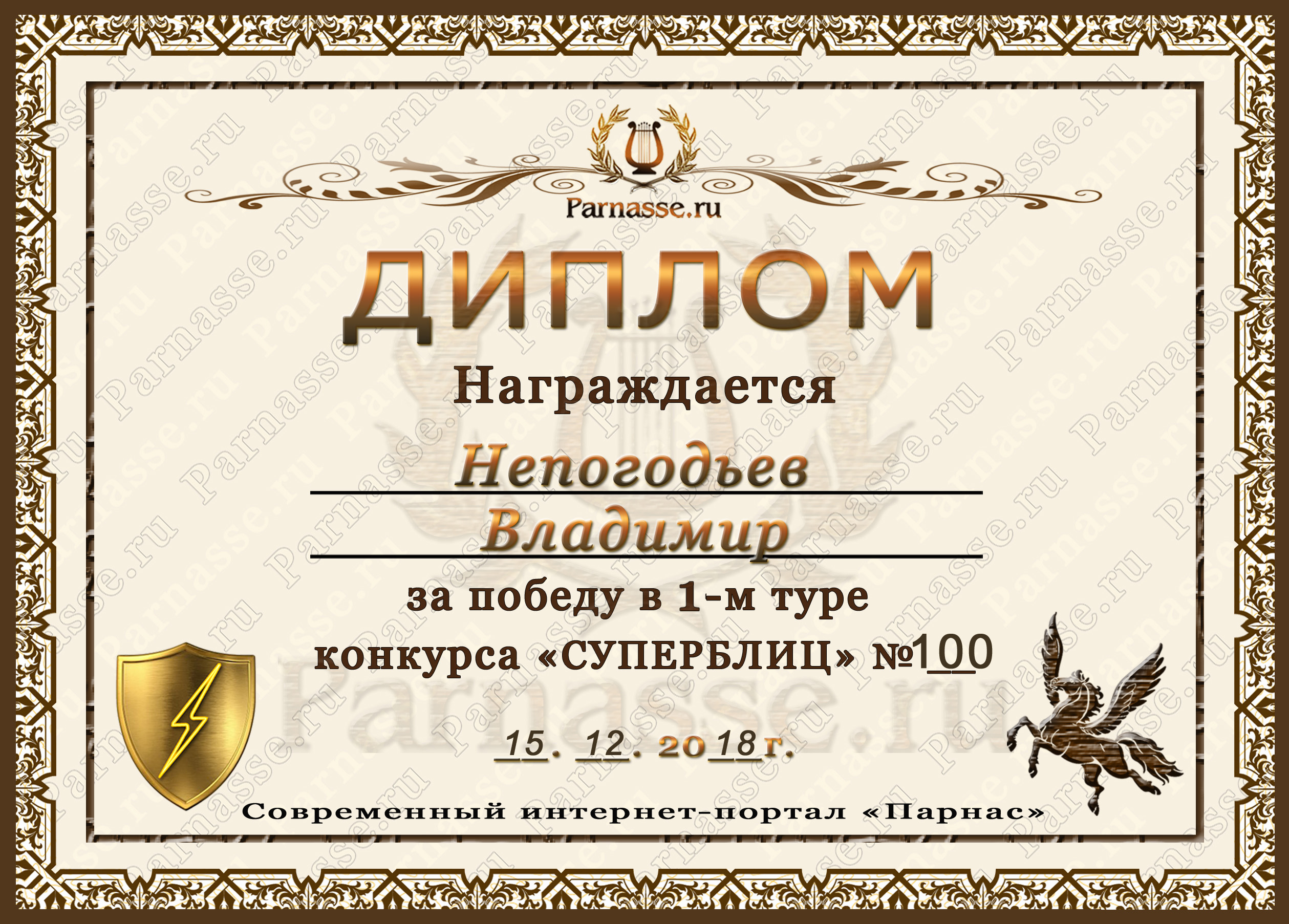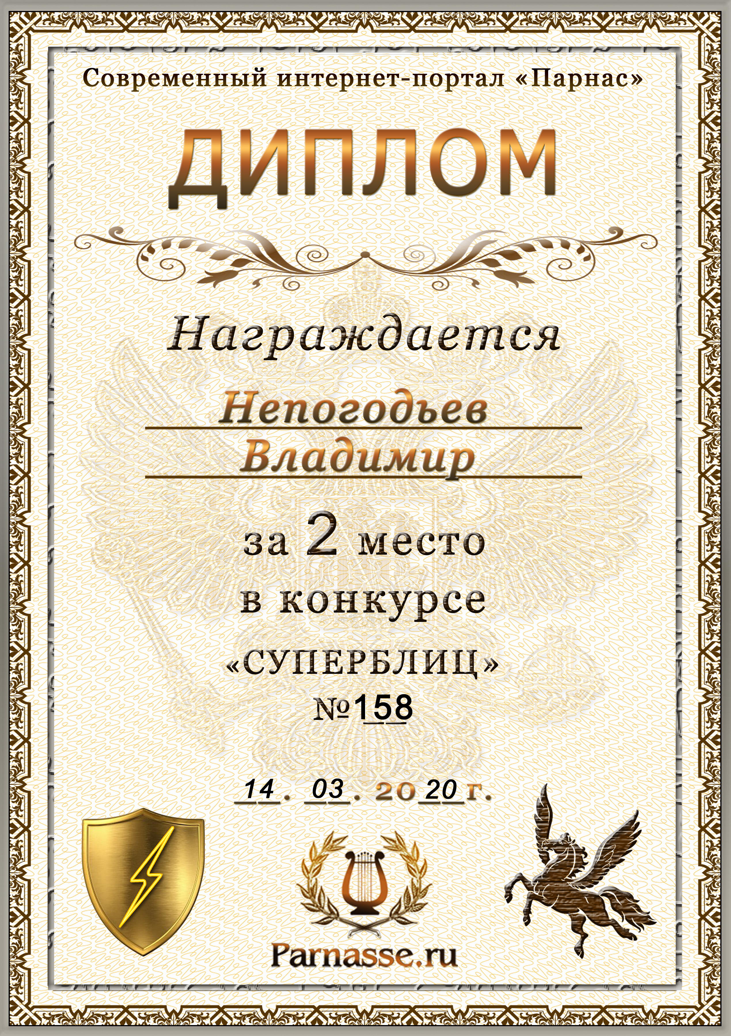 Диплом Победителя за 1 место в праздничном конкурсе "Поздравим Парнас с трёхлетием вместе!"