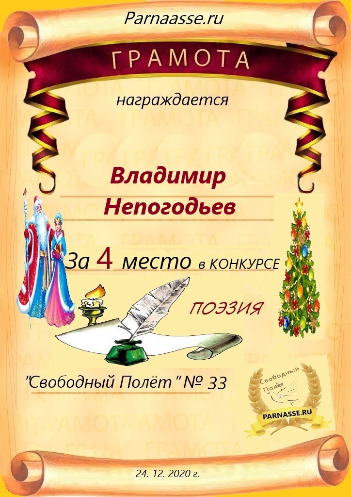 Поздравляю с победой - 2 местом в номинации Поэзия! Желаю счастья, благополучия и здоровья в наступающем году!