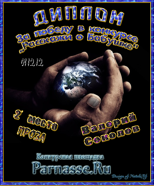 Первое место в праздничном конкурсе "ПОЗДРАВИМ ПАРНАС ВМЕСТЕ!", в номинации "Лучшее стихотворное поздравление Парнасу". Позвольте от всей души выразить Вам благодарность за прекрасные поэтические слова поддержки, самые тёплые пожелания нашему Парнасу и пожелать Вам новых побед на литературном поприще, успехов в жизни и всех Ваших начинаниях! Будьте счастливы, здоровы, пусть удача не покидает Вас ни на минуту и от всей души СПАСИБО! Оставайтесь с нами и мы будем вновь и вновь встречать Дни рождения "Парнаса" в одной дружной, душевной компании! Произведение "Сайт «Парнас», люблю тебя!"
