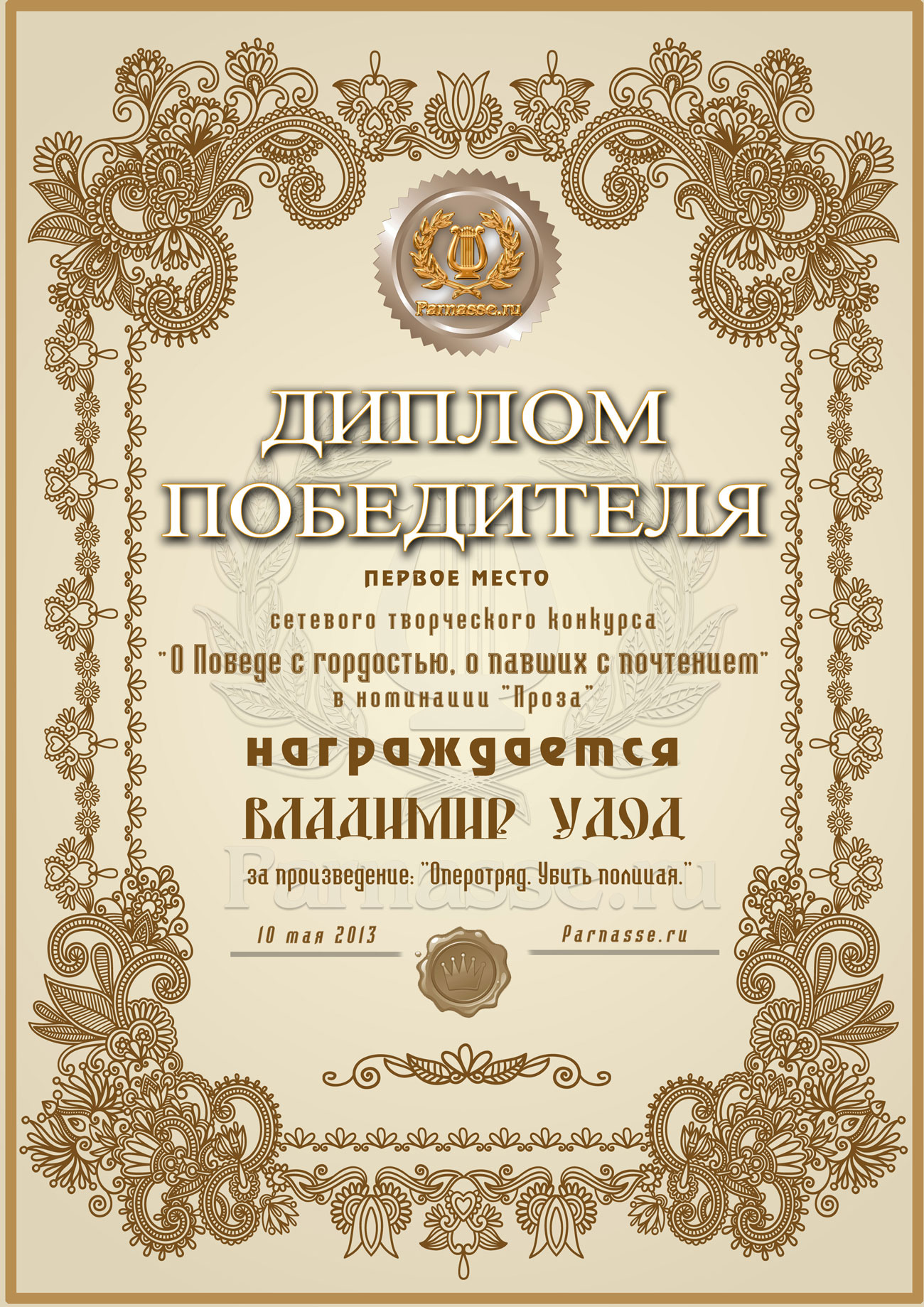 Первое место в музыкально-литературном конкурсе «О Победе с гордостью, о павших – с почтением!» Судейское голосование. Номинация в прозе «ВЕЛИКАЯ ОТЕЧЕСТВЕННАЯ ВОЙНА»! Произведение «Оперотряд. Убить полицая»! Поздравляем с блестящей победой!