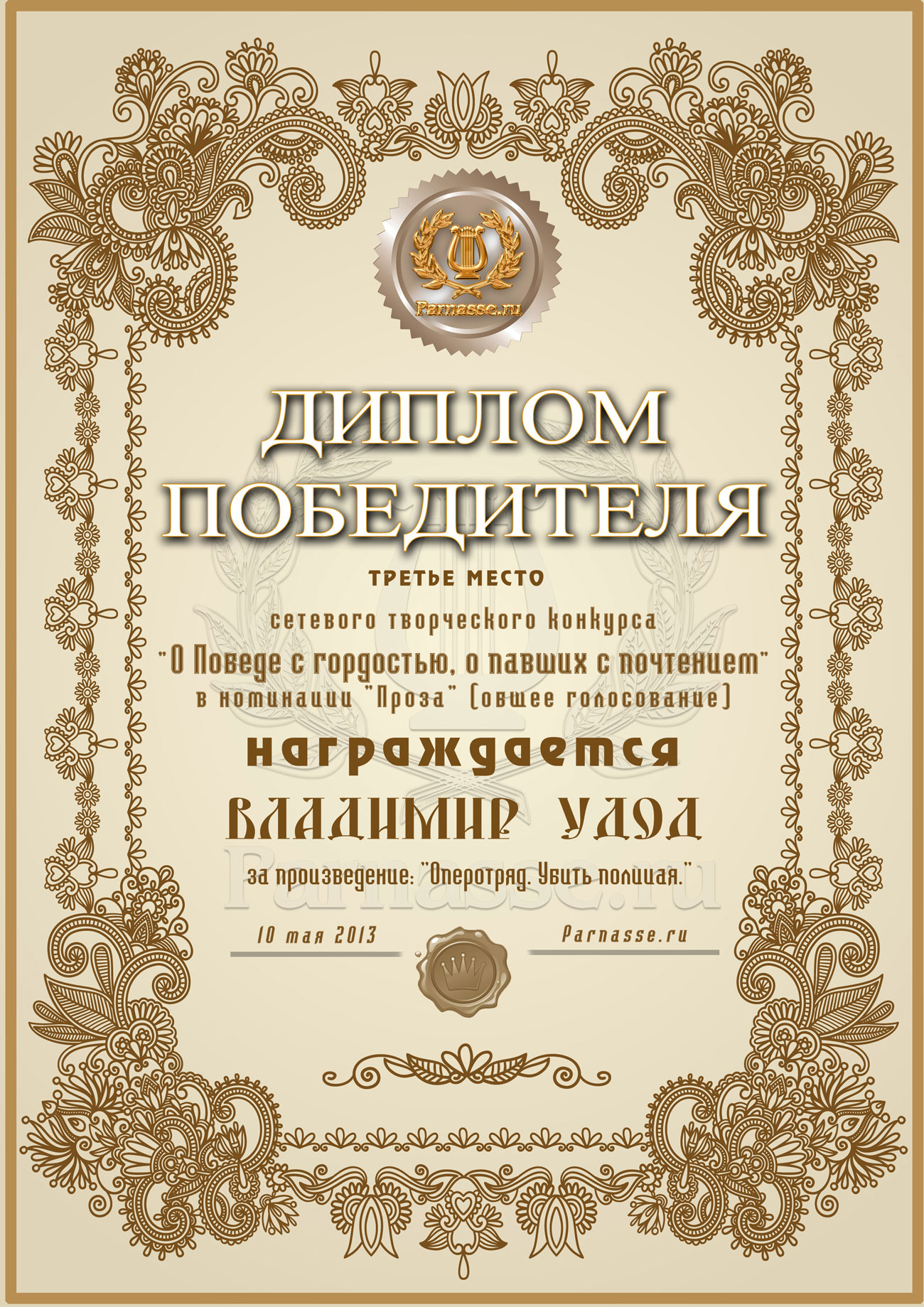 Третье место в музыкально-литературном конкурсе «О Победе с гордостью, о павших – с почтением!» Общее голосование. Номинация в прозе «ВЕЛИКАЯ ОТЕЧЕСТВЕННАЯ ВОЙНА»! Произведение «Оперотряд. Убить полицая»! Поздравляем с красивой победой!
