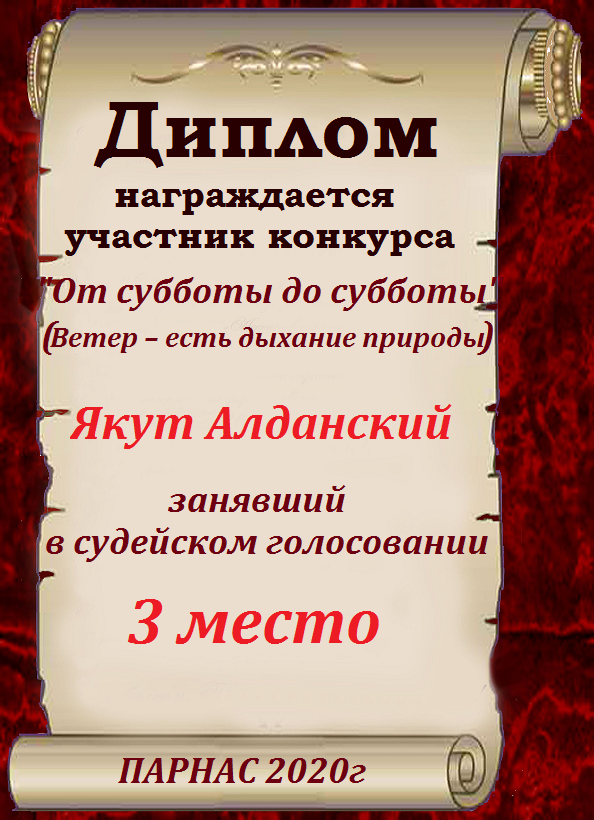Третье место по итогам конкурса «Ветер снова мне шепчет о счастье ", по итогам судейского голосования. Поздравляем с прекрасной победой!