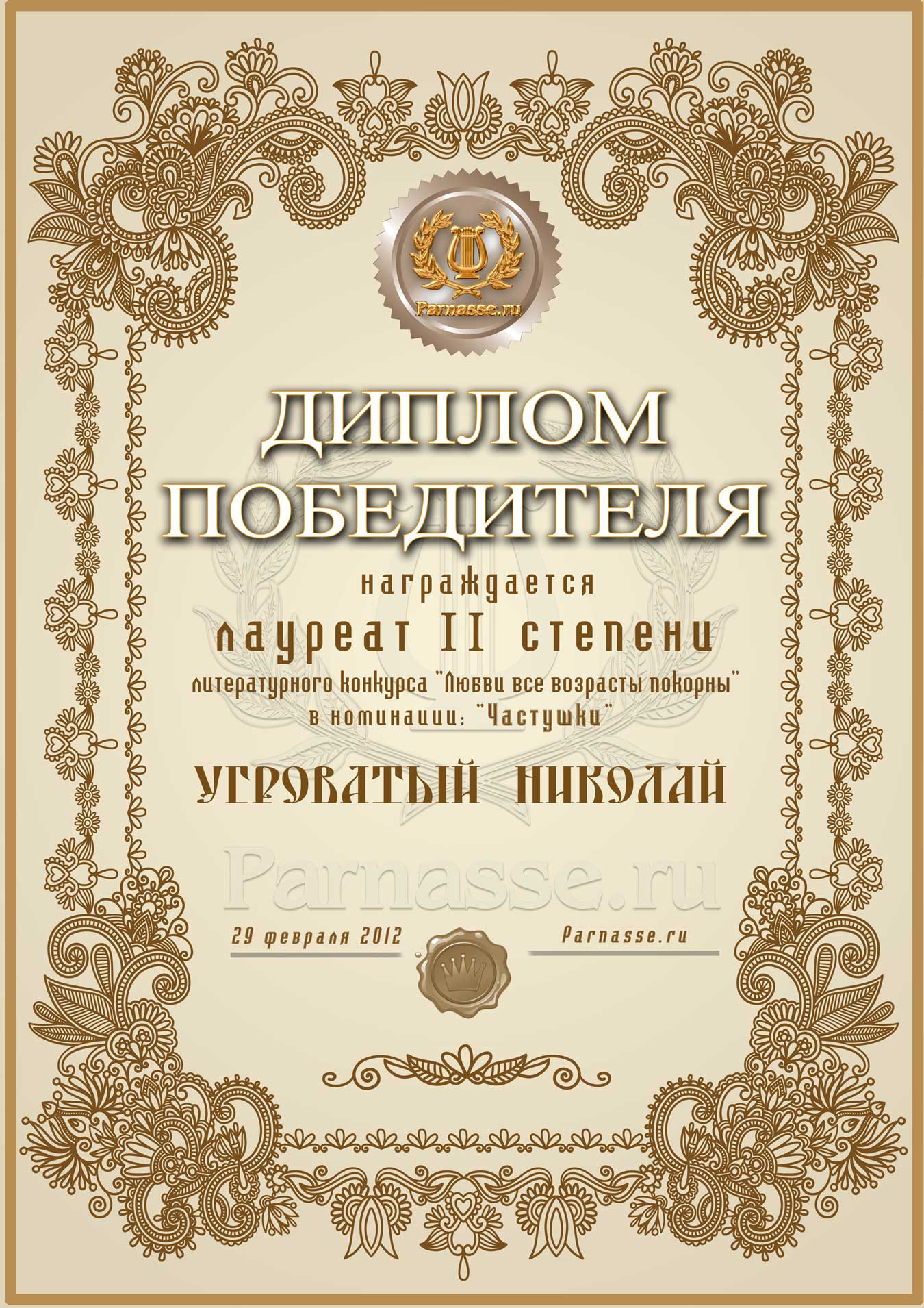 Диплом лауреата III степени лит.конкурса "Любви все возрасты покорны"