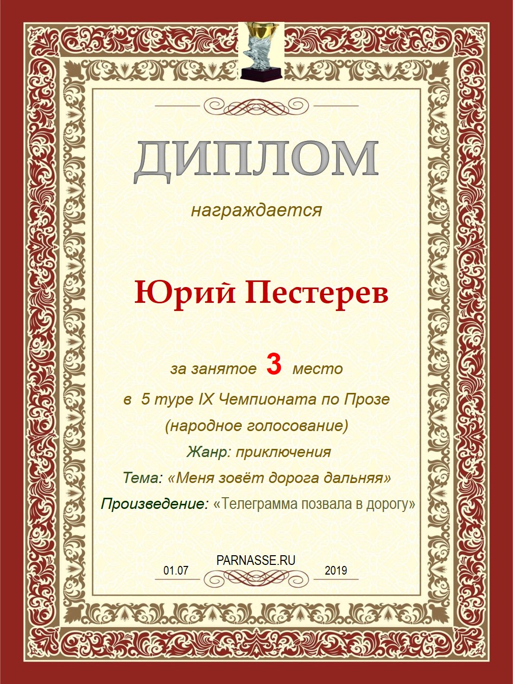 Поздравляю с занятым 3 местом в 5 туре IX Чемпионата Парнаса по Прозе - народное голосование!