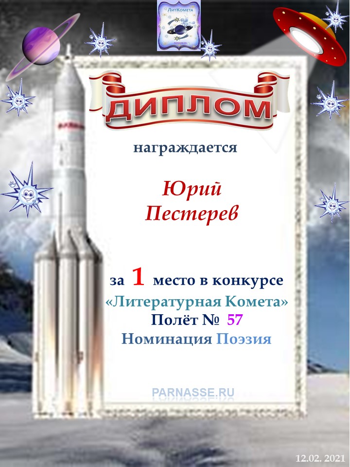 Поздравляю с занятым 1 местом в конкурсе "Литературная Комета - Полёт № 57" - Номинация Поэзия!