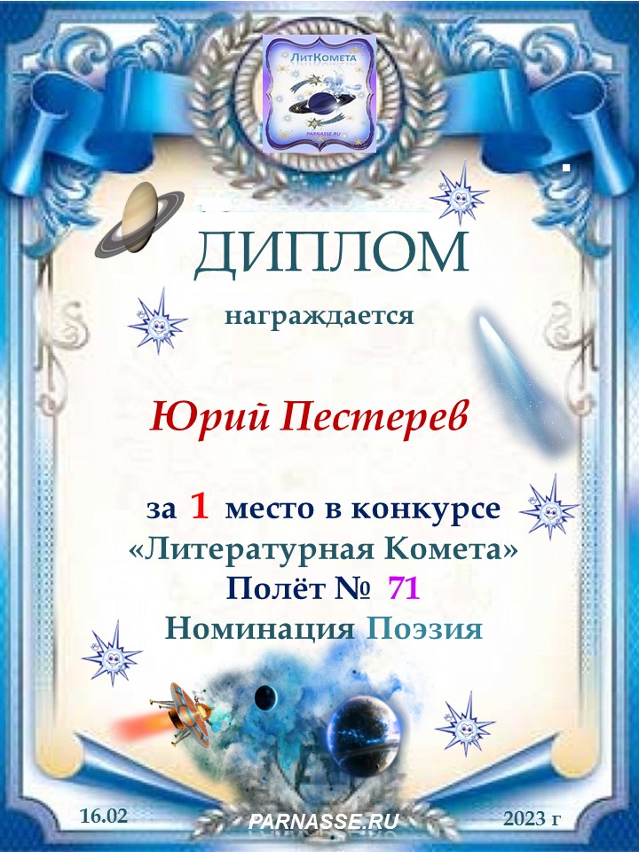 Поздравляю с занятым 1 местом в конкурсе "ЛитКомета-Полёт № 71" - Номинация Поэзия!