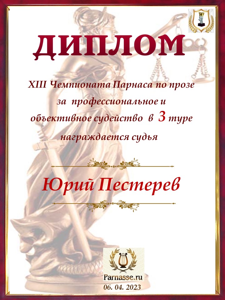 Спасибо за объективное и профессиональное судейство в 3 туре XIII Чемпионате Парнаса по прозе!