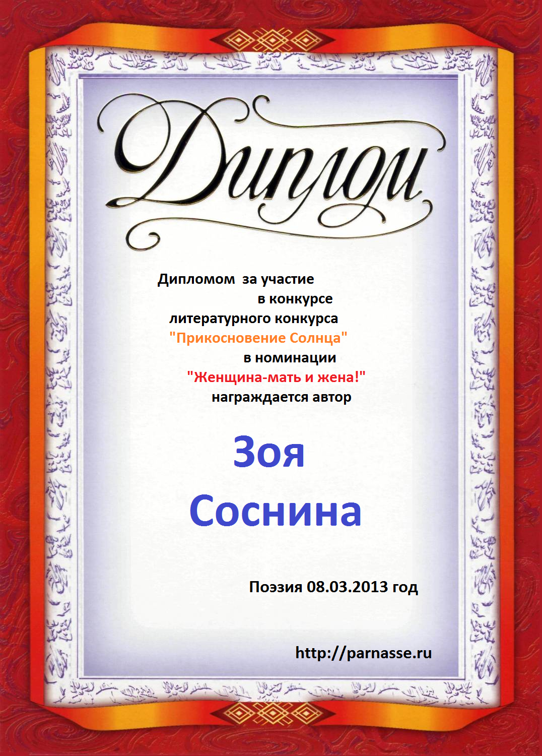 Диплом в конкурсе поэзии "Прикосновение Солнца"