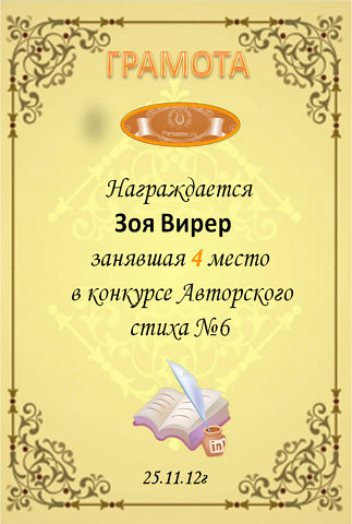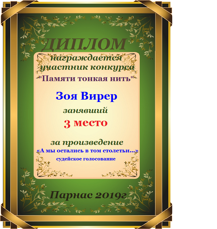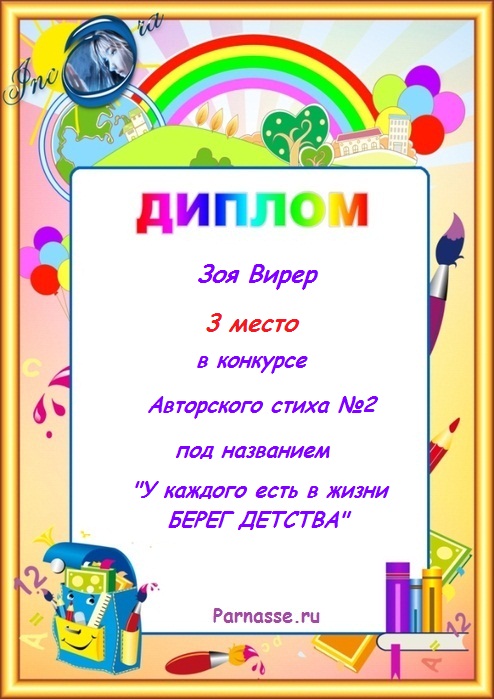 Диплом за 3 место в конкурсе авторского стиха №2 под названием "У каждого есть в жизни Берег Детства".ПОЗДРАВЛЯЕМ!