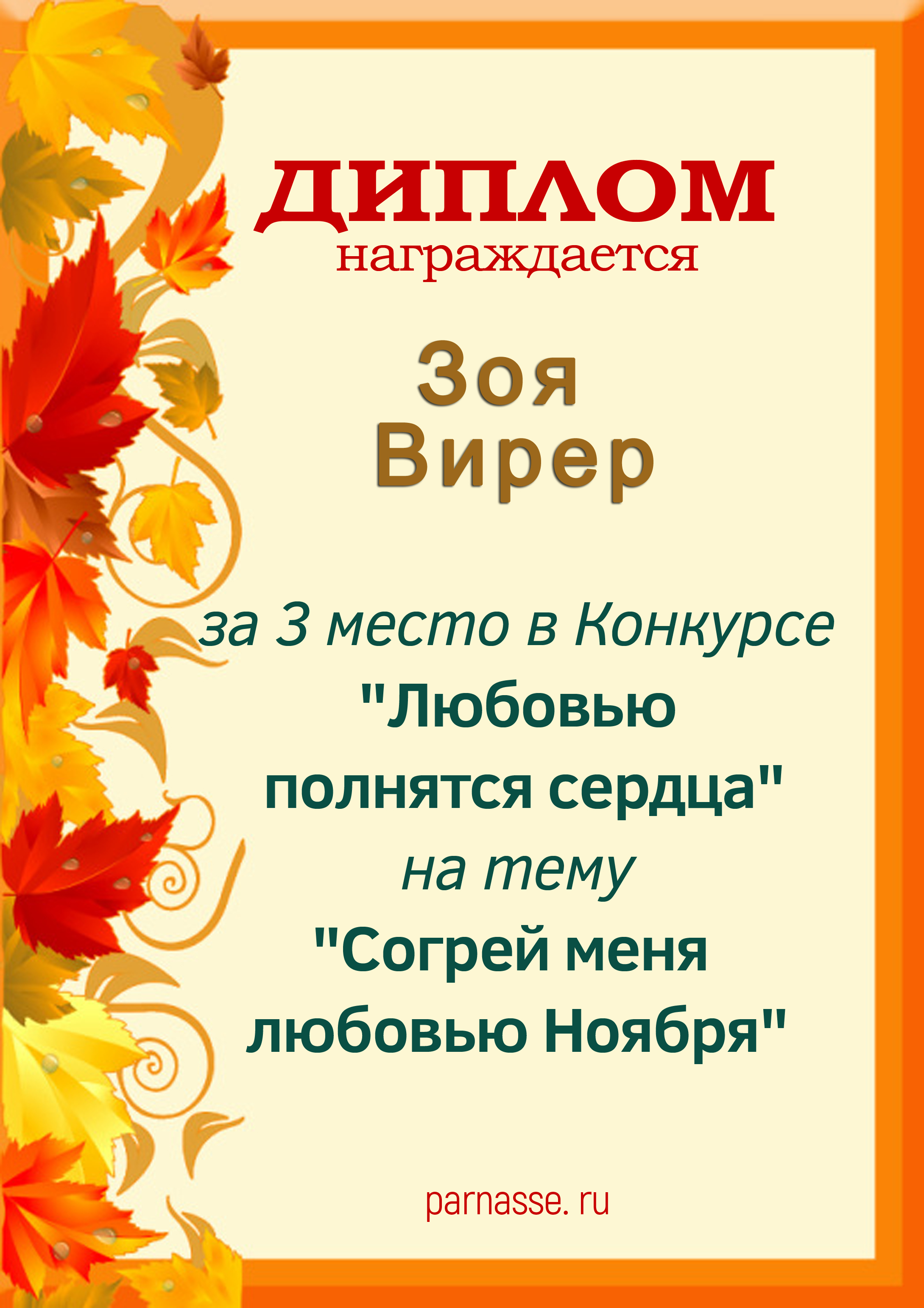 За 3 место в Конкурсе "Любовью полнятся сердца" на тему "Согрей меня любовью Ноября"